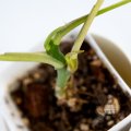 Philodendron Burle Marx Variegata. Sběratelská panašovaná forma s úzkými podlouhlými listy zdobenými krémově-žlutými až bílým mramorováním – každý list je originál. Tvoří kompaktní trs a ochotně větví; vhodný i na lehkou oporu. Světlé rozptýlené světlo, zálivka až po lehkém proschnutí ve vzdušném substrátu (citlivější na přemokření); více světla zvýrazní panašování. Přesazeno do nového substrátu.