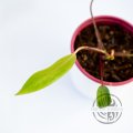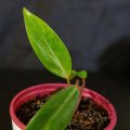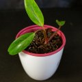 Philodendron Painted Lady. Šplhavý filodendron s neonově žlutými mladými listy, které postupně zelenají a mají jemné mramorování. Růžové řapíky dodávají rostlině výrazný vzhled. Má rád světlé rozptýlené světlo a zálivku až po lehkém proschnutí substrátu. Vhodný na oporu. Přesazeno do nového substrátu.